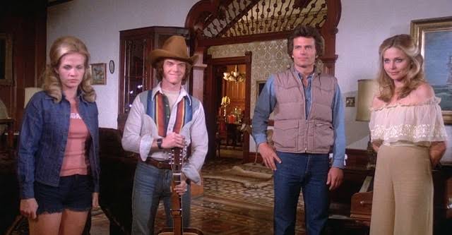 While the family works at patriarchal Cameron Mitchell's ranch until they can afford to move on, TEXAS DETOUR finds its central romance between great-looking Patrick Wayne and blonde bombshell Priscilla Barnes, who's Mitchell's daughter/James's rich-girl-with-a-heart-of-gold sister...